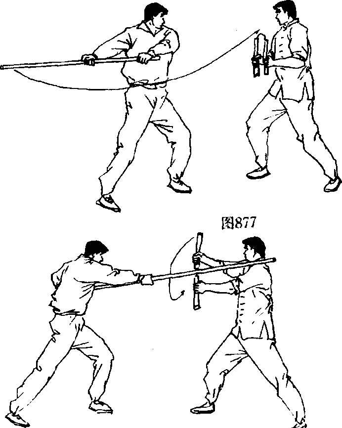 运用方法;当对手持棍攻来时(图877),李小龙可速用二 节棍予以格挡(图878),同时将右手中的一节向下缠绞敌棍 端(图879),然后可再抬起右脚,并用一记侧踹腿去重创对手 的中盘空当(图880),将其踢伤或踢倒在地。
