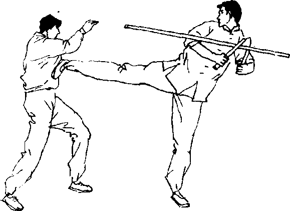 动作要领:格挡要快,要用巧力;缠绞敌棍要及时,以防其 抽回;侧踹攻击要连贯、有力而不失时机。据李小龙所说,侧踹 腿攻击时的攻击力,是由踢击之前猛然呼气发力并扭腰展散 所产生的,而且此技法需要天天练习,直到掌握了其中的诀 窍,即在攻击时能毫不犹豫地形成一个平稳、快速、强劲、准确 而连贯的整体动作。在实战中运用本招法时,要充分借助腰腿