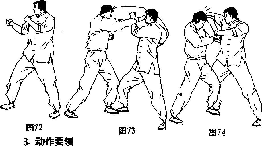 由戒备势开始(图72),如对方以右拳攻击我头部时,我 方先以左手屈臂格挡来拳(图73),但这种格挡不宜过于向