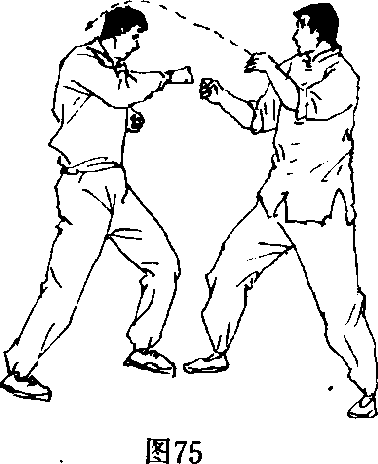 外,只求格住来拳而不使自己受伤为限。而且借此机会,在拧 腰转体的同时,右臂曲成平肘向前重创对手的头部或颈部(图 74),将其击昏或击倒在地o