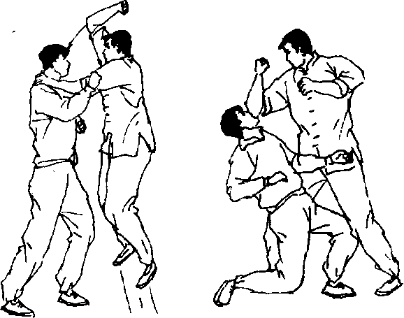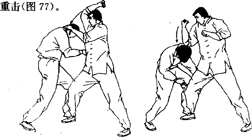 龙常先用左手下按敌头部(图75、图76),然后再用右肘施以龙常先用左手下按敌头部(图75、图76),然后再用右肘施以图76图76图77图77(1)当敌下俯或迫近抱我身, 图以力搏时,可擎臂曲肘,下击其 肩胛、后背或头部。用此式时李小