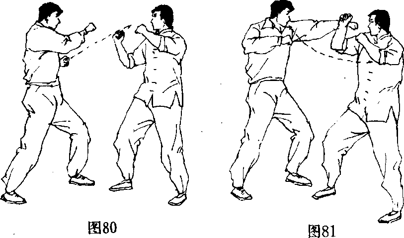(3) 迎战时以虚足乱敌意图,接着凌空擎右肘,下砸其头 或前额(图78、图79),并由于借助了身体下压之势,因此威力 倍增。此为李小龙惯用之招法。