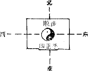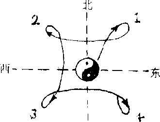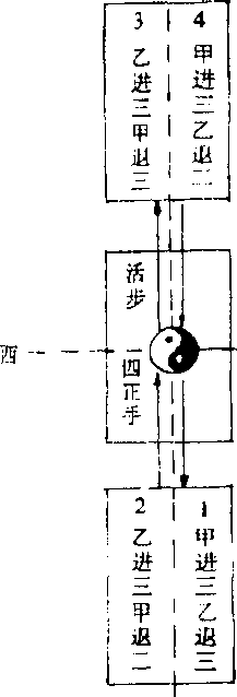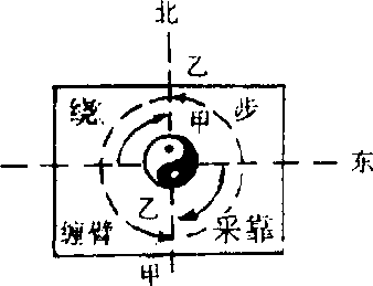 注:顺时针甲、乙向右绕步 相逆时针甲、乙向左绕步― 130— 南 中合步厂q四正手乙 南 中合步厂q四正手乙第七组 活步四正手线路示意图北东东第八组大捋线路示意图I 南注:大捋共做四次.第九组顺步四正手线路示意图