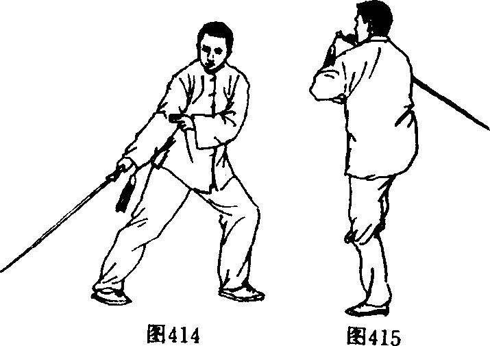1. 弓步下劈:身步不动,右手握立剑向身后劈落,剑尖斜 向下,高与踝平齐;左手剑诀按肘臂内,眼看剑尖。(图414)