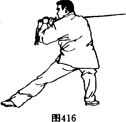 b震脚落步:右脚落地震响,同时左脚离地,重心下移, 向前出步。左手握把贴近右手掌缘,靠近剑督一端;腰稍向左 转。眼看前下方。(图416)