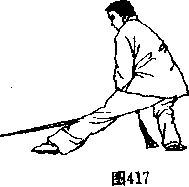 2. 裆步劈剑:上动不停,左脚脚掌内扣,成仆步(如初学 或年纪大者架势可以高些,成横裆步)同时双手握剑在体前劈 下,剑尖向西。点看剑尖。(图417)