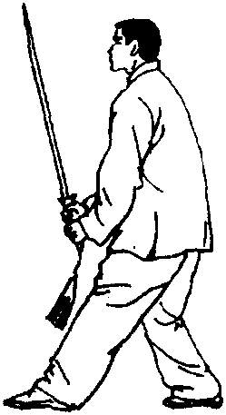 1. 上步反截;重心上移,两膝微弯向上蹬直,右手反手握 剑提向面前,以外侧剑锋向左侧截,剑尖向下,与下落的左手 剑诀相合。剑诀按前臂内侧。同时右脚向西侧上一步。眼看 剑锋。