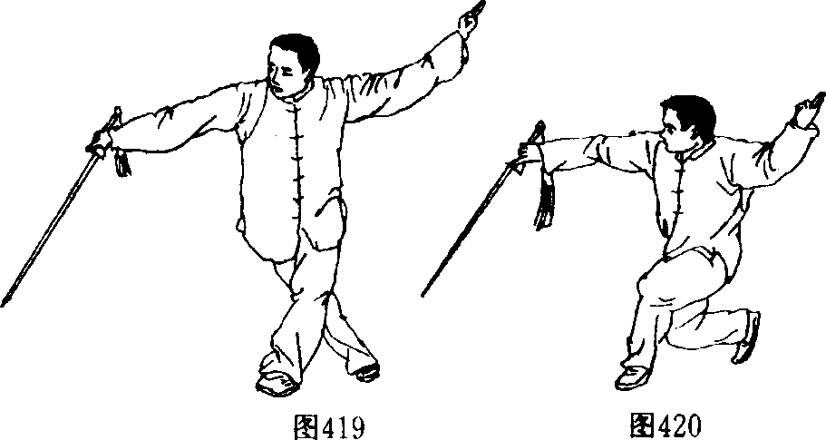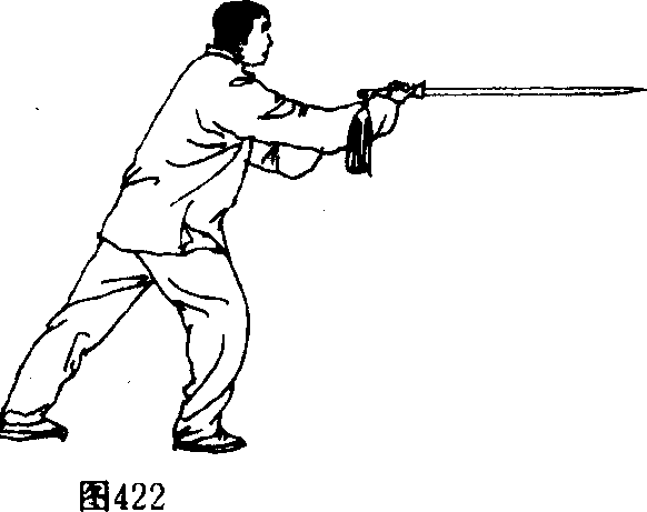 右脚以脚跟为轴,向左转体,面向东成右弓步;同时右手 反手由下向前立剑上撩,剑尖高与喉平齐,左剑诀按腕,眼看 剑尖。(图422)