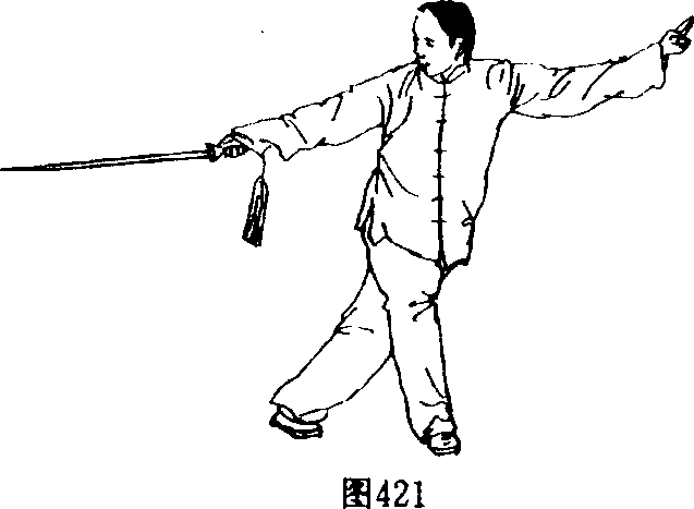 2. 插步下劈:接上动,右脚向西上步之后,左脚随即向右 脚后横插步。同时两手在面前向左右弧形分开:腰向右转,右 手握剑,向左上部再潮剑向右下侧,手心向甫,笏向西。左 手剑诀坐腕,手心斜向外,重心落在右脚,眼回望剑尖。(图 421)