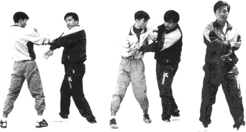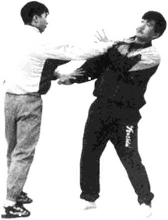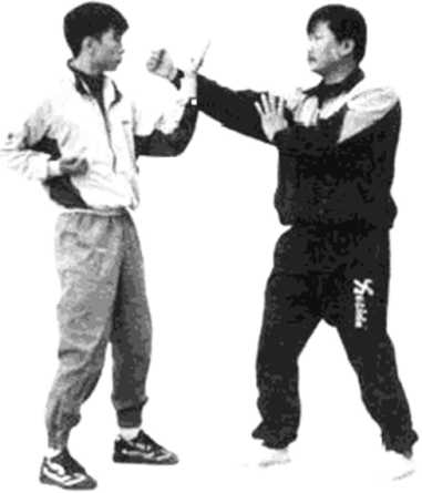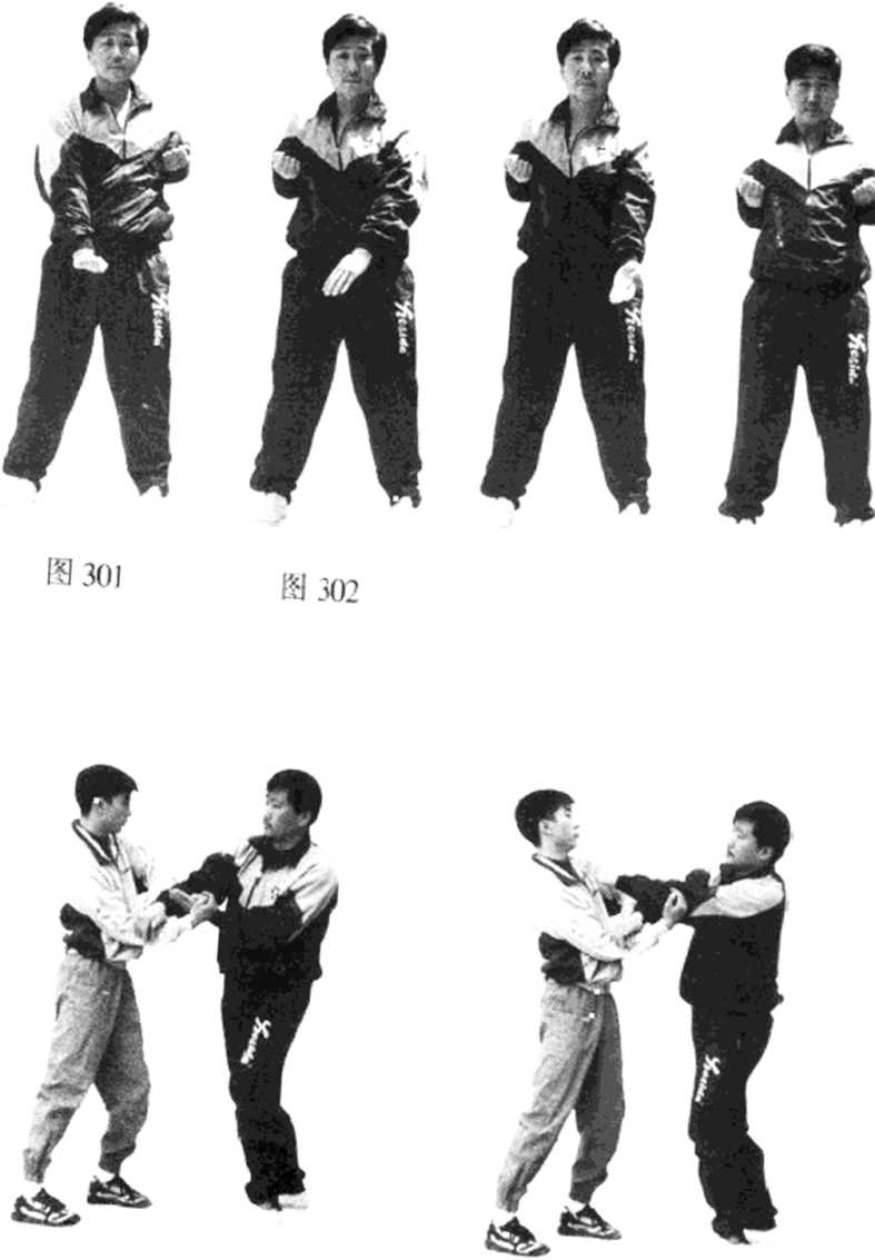 甲方用右手标指(或拳)打乙方中路,乙方即可用摊手 摊住甲方的来手,并突然下按甲方右手,同时标出阴掌直插 甲方的喉部(见图307、308)。