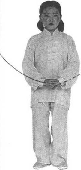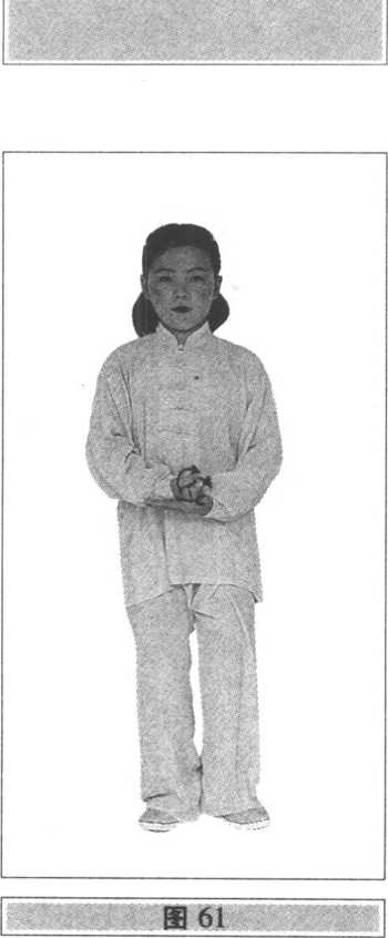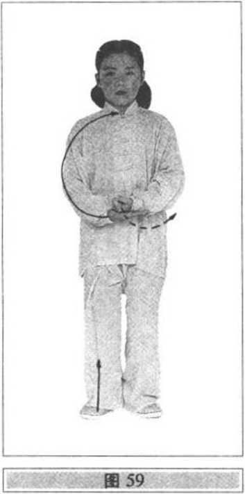 ⑵右腿屈膝稍蹲,随即左脚尖稍外撇,全脚踏地震脚, 头微上顶(要用虚脚弹震,上体不要下沉和前俯后仰左右晃 动);同时,左拳下落至腹前(贴近肚脐),用拳背砸击右手心, 右手微向上迎击(震脚与砸捶的响声要一致;两脚跟相距约 10厘米);眼看前方(图59)。