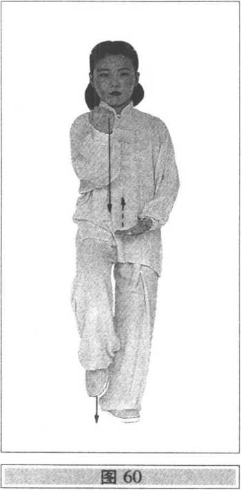 ⑴右脚撤回原地,脚尖内扣,上体微左转(面向南),重心 称至右腿;同时,左拳内旋变掌向下、向里、向左,手臂再外 旋向胸前穿掌挂拳,拳心向里,腕高与肩平;左膝上提,小腿 与脚尖自然下垂;右手先内旋后外旋,向右、左划弧至腹前, 手心向上,五指并拢,手心微凹(图58)。