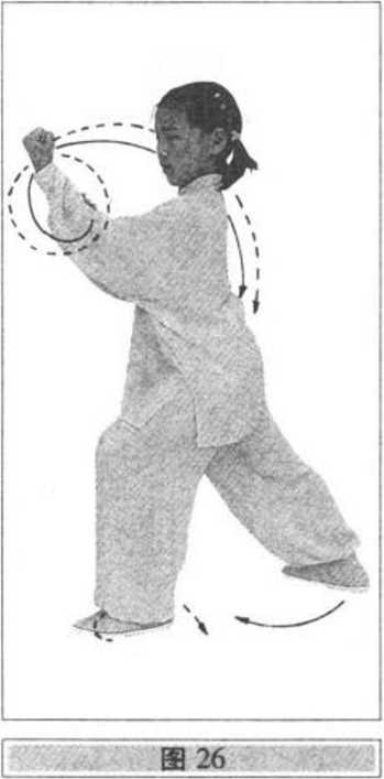 ⑴身体稍起微右转,重心移至右腿;同时,右拳变掌向 左、向下、向右划弧下落至右腹前,左手变拳上提至右腹前, 拳臂微内旋,拳心斜向前下方;右手附在左前臂外侧(图 25)。