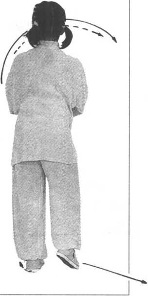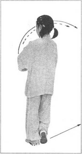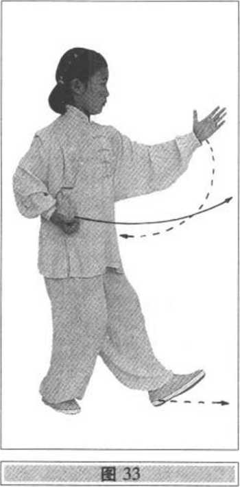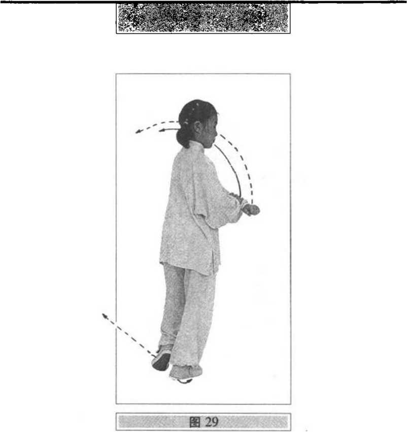 ⑴重心后移,上体左转,右脚尖稍内扣,随之重心移至 右腿,左脚收至右脚内侧,成丁步;同时,右拳变掌,左手从 右前臂上穿抹,两手一齐划圆,左手在腹前变拳;其他动作 参照西南转东北(图29)。