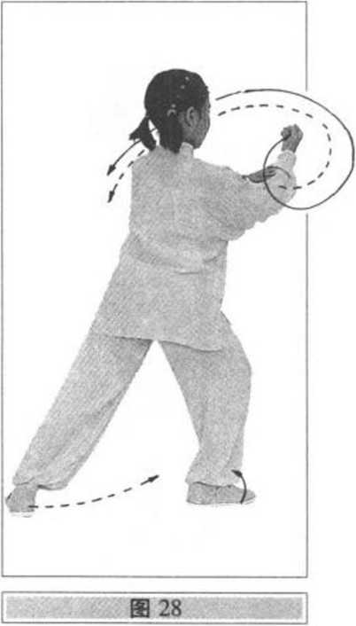 ⑵上体继续右转,右腿向东北迈一步,重心前移成弓 步,右拳向东北撇打;其他动作与向西南同,惟脚手的动作 与方向相反(图28)。
