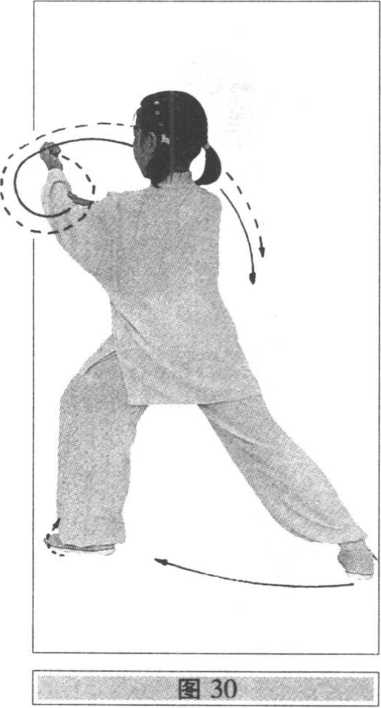⑵上体再微左转,左脚向西北迈一步,重心前移成弓 步,左拳向西北撇打;其他动作与向西南同(图30)。