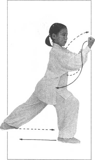 ⑵上体微左转,左脚向西南45。迈一步,重心前移,左 腿屈膝弓步,右腿自然伸直(膝部微下沉);同时,左拳上提经 面前向西南撇打,拳心斜向上,拳高与眼平(左肘微下沉与 左膝上下成垂线);右手随左拳向前附在左前臂内侧;眼看 左拳(图26)。