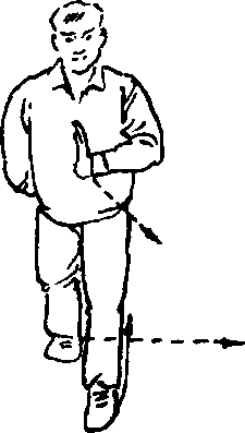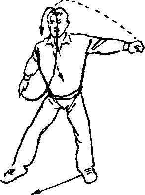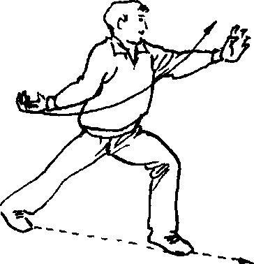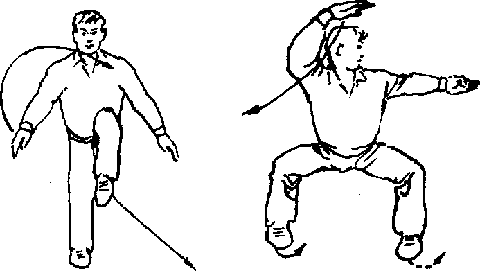 ①身体右转45。,右脚向右跨一步落地,右掌同时向右、 向下摆落向身右后方(图15)。
