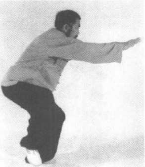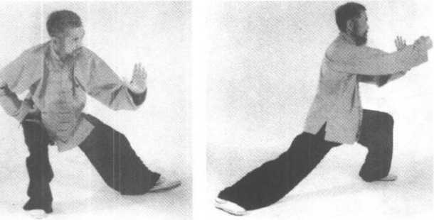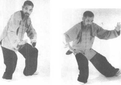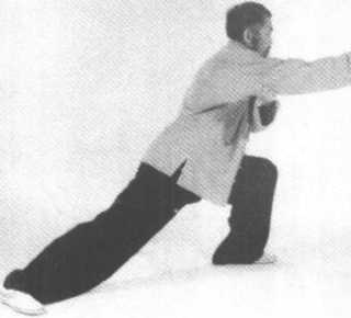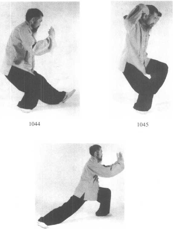 移于前后足之间,以腾空跃步之势,右后足垫踏前左足之位,同时 右掌变为立拳往外朝里转圈至腰间,徐徐往前伸出,而左手变为 立掌,护住右拳之臂,渐变为左弓步(图1039?1042)。