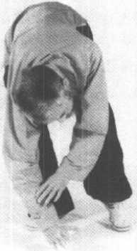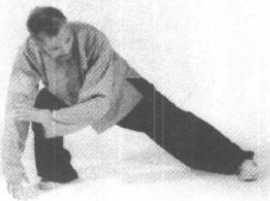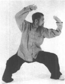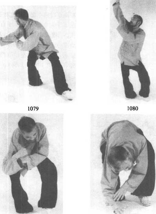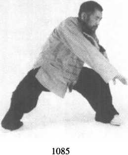 重心移于右脚成扑步势,左 手仍扶着右臂,随着腰的转动, 手臂从右至左贴,身由下至上旋 转一圈,然后再从右上角从右至 左再从左至右复一圈,手臂于前 额头顶时两手似拉弓之势拉开, 左手于左前方,右手于百会穴 顶,两腿成大马步,然后以腰移 动重心成右弓步势,右掌向右侧 按出而左掌护于左前额与近百 会穴处(图1084-1086) 0