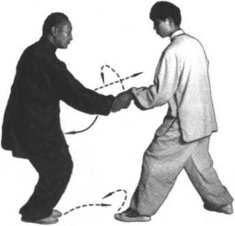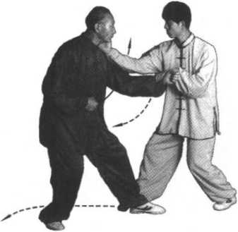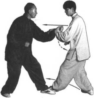 (1) 甲的并步崩拳再次被阻截,紧接着又是一个顺步左崩 拳,乙见甲步步紧追,不宜再退,即右脚后撤半步,左脚亦随之 后撤,脚尖外摆,重心偏于左脚;同时,稍翕身下蹲,左掌随撤 步后抽,紧接着挑缠甲之左小臂,向左侧刁捋,使其失重前倾, 柔化其进击(同图4-14)o