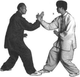 甲将右立侧掌劈拳挑开后,乙即右脚后退一步,成三体式 步;同时,右掌内旋后撤屈肘停于脐前,掌心向下;左掌与右掌 在胸前相交后劈出,还原三体式。