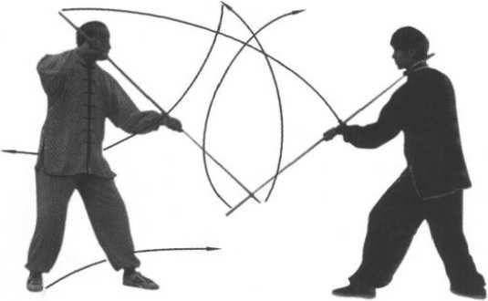 其动作与甲相同,只是甲上击,乙即上迎,两人动作相同, 相互配合协调即可(同图2-6、图2-7)。