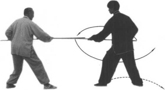 在上步时双手后滑,使把段前伸,双手仍为阴阳把握棍,以 下同。