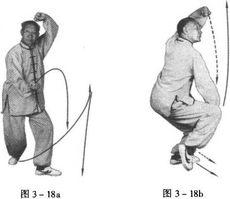 接上式,上身稍起略右扭,原势不变,左脚向右前方上半 步,脚尖外摆,跺地震脚;接着右腿提起弹踢,在右脚收回时身略 向左转,左腿屈膝半蹲,右腿屈膝,脚尖点地于左脚内侧成丁步洞 时,左臂不动,右小臂内旋向右划弧,拳面朝下,拳眼向里,向裆前 栽击,臂微屈,目斜视右方(图3 - 18a、图3 - 18b)。