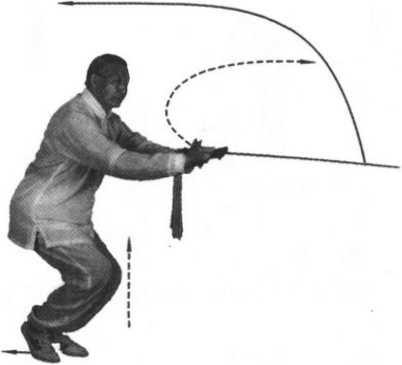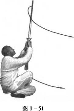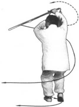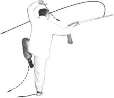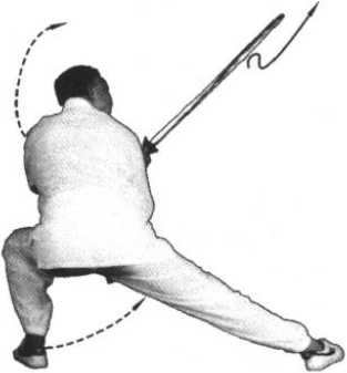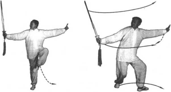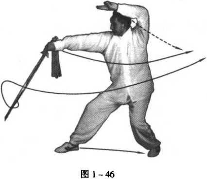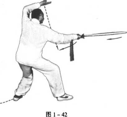 左脚后落,身略右扭,两腿屈膝成半马步;同时,右手持剑 下挂后紧接着向右抡劈,剑与臂平;左剑指亦随着右手顺时针环 绕停于头上前左侧,目视右方(图1 -42)。
