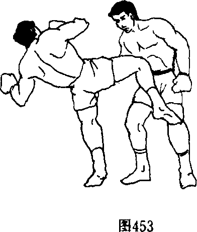 双人呈格斗式,乙纵步上前突然以右摆拳横击甲太 阳穴时,甲左脚速向左前侧跨步弯腰防,随即在右脚稍上步的 同时,用右撬肘攻击乙下腹部,紧接起身后仰以右短膝连续攻 击其胃、腹部(图452、图453)。