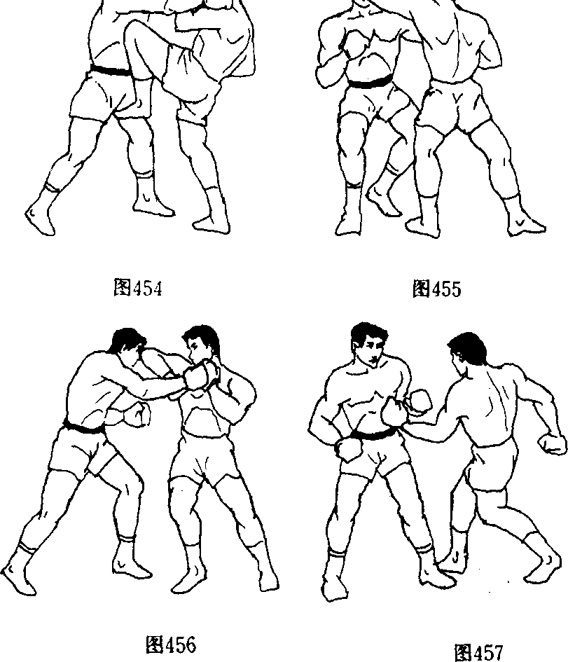 17 .双人呈格斗式,乙在左刺拳假动作的掩护下,以右摆 拳横击甲太阳穴时,甲右脚迅速向右侧上前方跨一步起跳,以 左跃膝猛击乙胸膛,左脚下落同时,以左切肘切击其面部(图 454、图 455)。