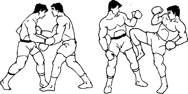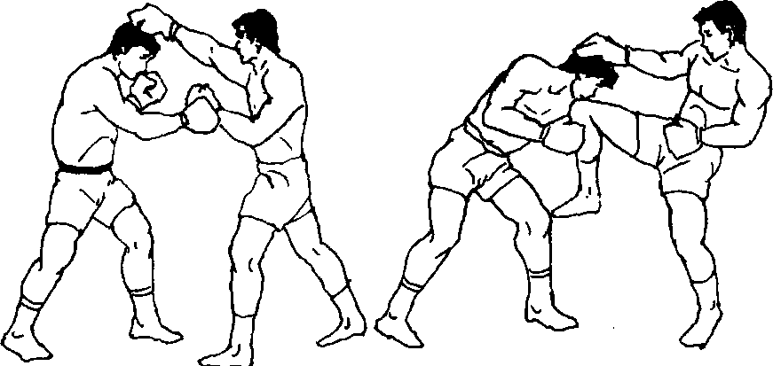 19 .双人呈格斗式,乙前垫步刺拳佯攻,?以右摆拳打击甲 头部左侧时,甲即以左小臂向左上挑挡,同时右手抢抓乙头发 或搂抱后脑往下拉压,并用右上膝猛撞其面或胸部(图458、 图 459)。