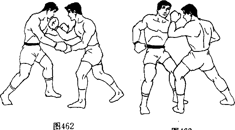 2.双人呈格斗式,乙在刺拳的掩护下,以右勾拳猛击甲 胸腹部时,甲即以左小臂外侧下砸乙攻击手臂,同时身体前倾 以右上勾拳勾击乙下腭,随即左撬肘自下而上猛撬其胸腹部, 前即左转身用右直拳打击乙疗而部(图462、图463)O
