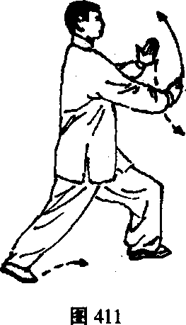 L上体微向左转,左手翻掌向下,左臂平屈胸前,右 手向左上划弧,掌心转向上,与左手成抱球状;眼看左手。 (图 411)