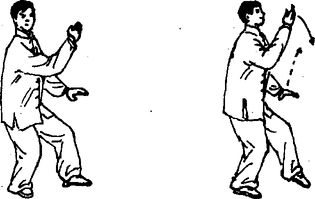 2 .右脚跟进半步,上体后坐,身体重心移至右腿,上 体先向右转,面向右前方,右手提于右上方,左手带于右胸 前;眼看右手。(图412)