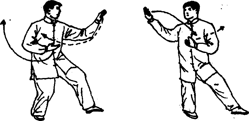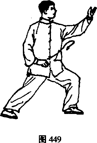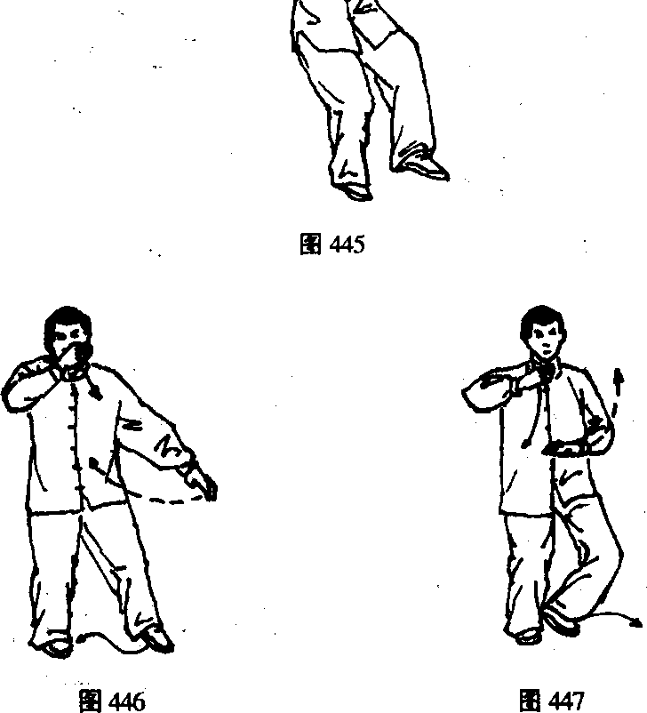 1 .上体微向右转,同时右手随转体向后上方划弧平举, 掌心向上,左手放松,掌心向下;眼看左手。(图445)
