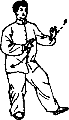 随身体右转,两手相合,左脚向前迈出时,均匀吸气; 左脚跟着地时,吸气止。意识引导右胯松沉,意气注入丹 田,使左脚的迈出与左手的内合相对应起来。再随重心前 移,左手向前期出,改为呼气;意识则引导松腰松垮,命门 前顶,意气注入右手,使身体左转与右手采按协调一致。此 势完成1吸1呼的呼吸转换。