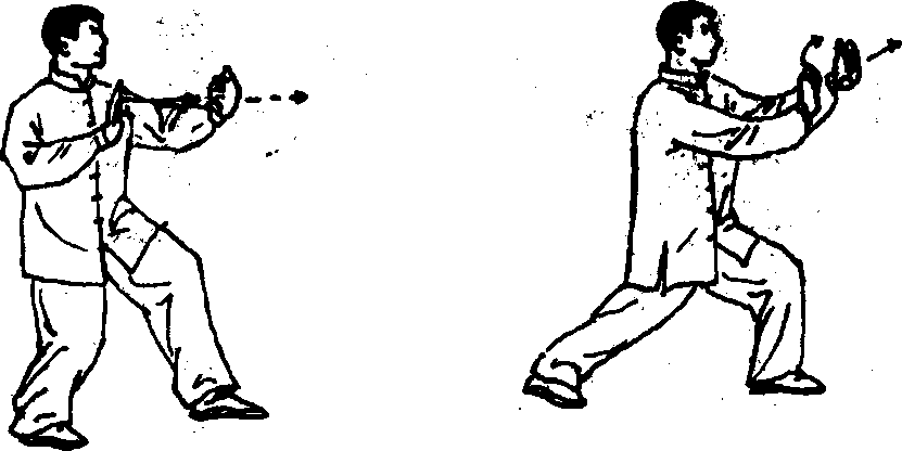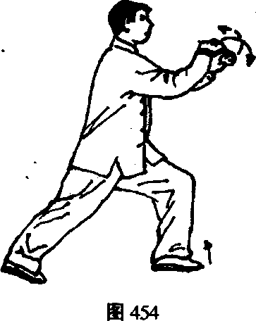 5,上体微向左转,右臂屈肘折回,右手附于左手腕里 侧(相距约5厘米),上体继续向左转,双手同时向前慢慢 挤出,左掌心向右,右掌心向前,左前臂保持半圆;同时身 体重心逐渐前移变成左弓步;眼看左手腕部。(图452、453)