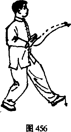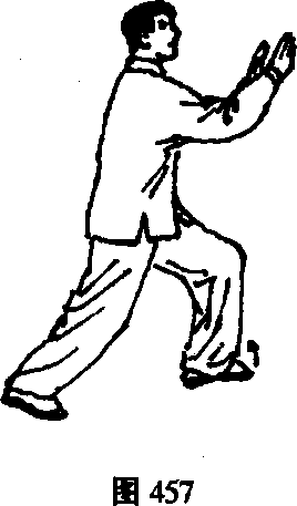 7 .上势不停,身体重心慢慢前移,同时两掌向前、向 上按出,掌心向前;左腿前弓成左弓步;眼平看前方。(图 457)