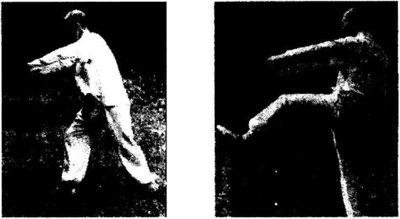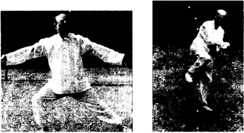 1. 左足下落,重心随之右移,双臂左右分开(图107)。