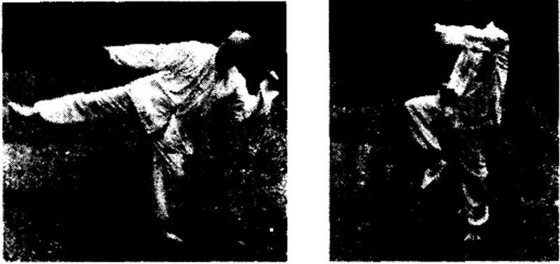2. 随即提起左足,自后下向右斜上孤形旋转,以左足内 侧与左掌迎击,转体约180度,此时面向北(图106)n