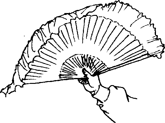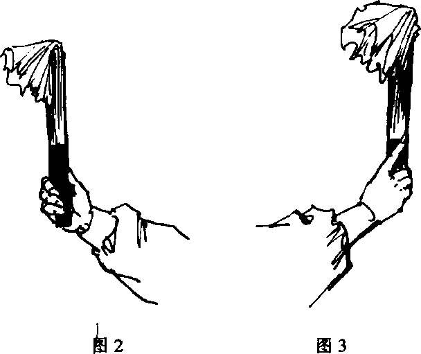 (一)合扇握法拇指、中指、无名指、小指握扇,食指伸直贴于扇面(图2、3)。(二)开扇握法之一大拇指扣压在扇端和大扇骨上,食指、中指、无名指、小指 压于另一面小扇骨上(图4、5)。
