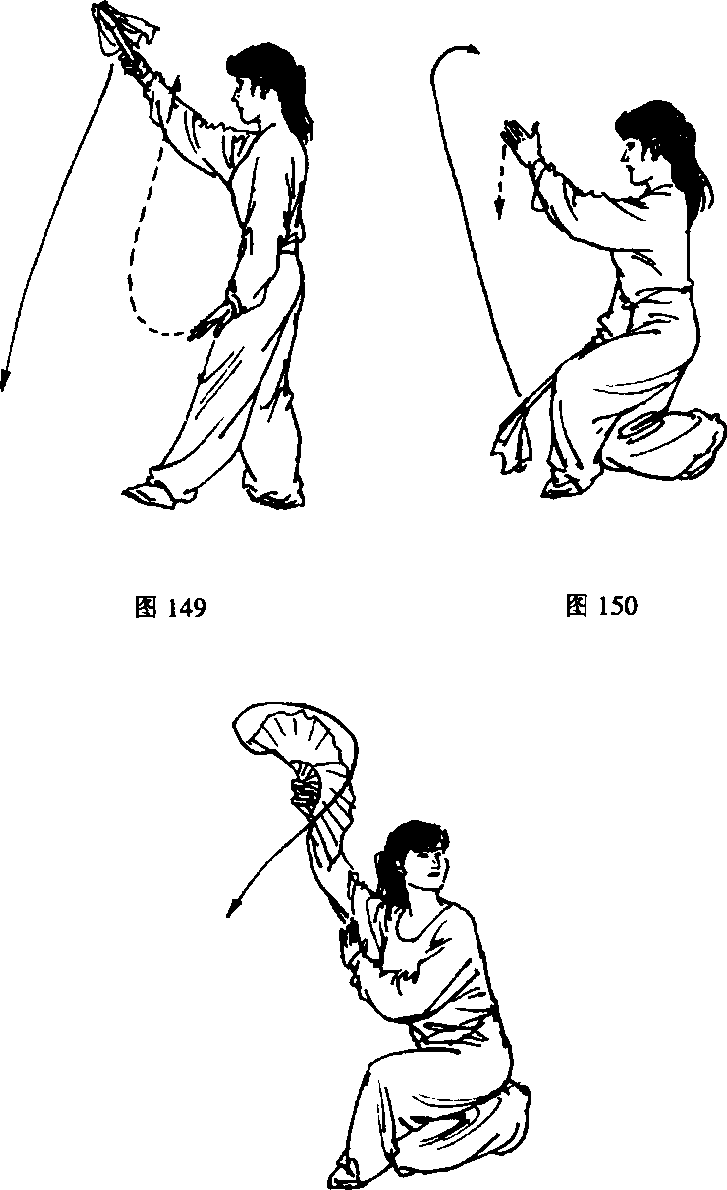 2 .两腿屈膝全蹲成左歇步。同时左手向外、向上摆至肩 前上方;右手向左腿前下落,手心朝内,扇顶斜向下。目视前 方(图150) o