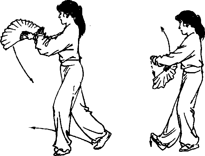 2 .右脚向前上步,脚跟着地。同时右手向下收至腹前,手 心朝内,扇顶朝下;左手心朝下(图153) o