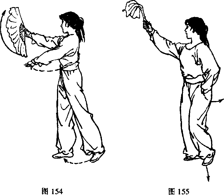 3 .右脚掌落地,重心右移。同时右手虎口朝上,扇骨尖朝 上,经左前臂内侧向上抬起。目视右扇(图154)。