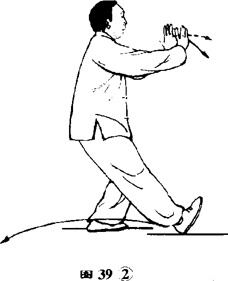重心慢慢前移成左弓步;上 体微左转(胸珣东〉;随重心升起, 左手向前上方举起,臂微屈;右手 附于左肘内侧下方;接着右脚向 前上步,脚跟着地;同时右手伸向 左腕下,使两手在胸前交叉搭腕, 左手在里,手心分别向外,手指斜 向上,臂微屈;眼看两手之间。(图 39①?②〉要点:由下势过渡到弓步时,身体 重心移动要平稳,同肘要沉胯、立 腰,不要弓腰、突臀,搭腕和右脚 上步要协调一致。