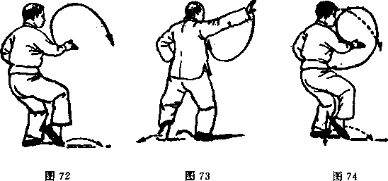 动作:此式跃起转身后,左拳撑腰,接着右手在胸前以顺 缠划圈。当右手往下划圈时,右足随即提起为虚。(图72)当右 手往上划圈时,右足又落地为实,完成一次“搅水”。(图73)接 着继续再做两次“搅水”动作。(图74、73,再接74、73、 74)