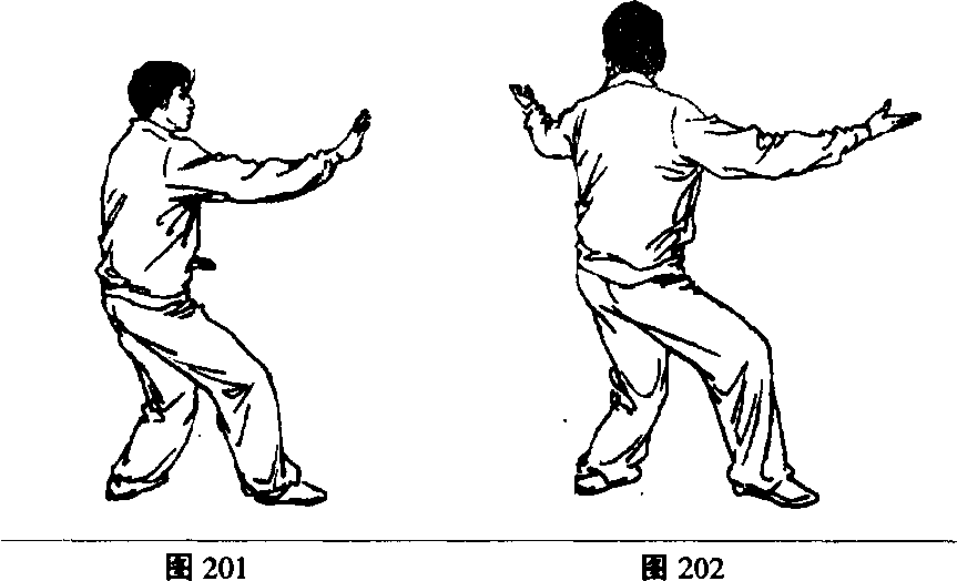 6 .上体左转,左手向后划弧展开,举于身体左后方,掌心 向上;右手同时翻转向上。眼看左手(图202)。