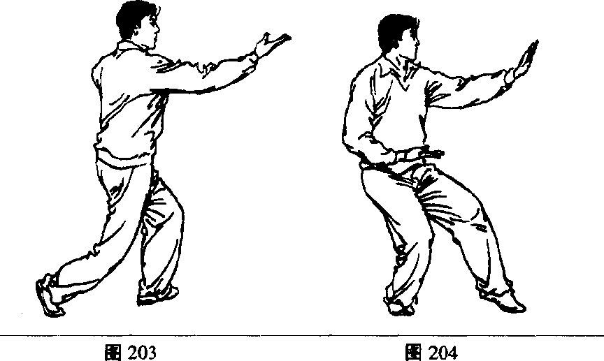 8 .重心后移,上体右转,左脚扭直,成左虚步。同时右手 收至右腰间,左手向前立掌推出。眼看左手(图204)。如此左 右交替退步推掌练习。